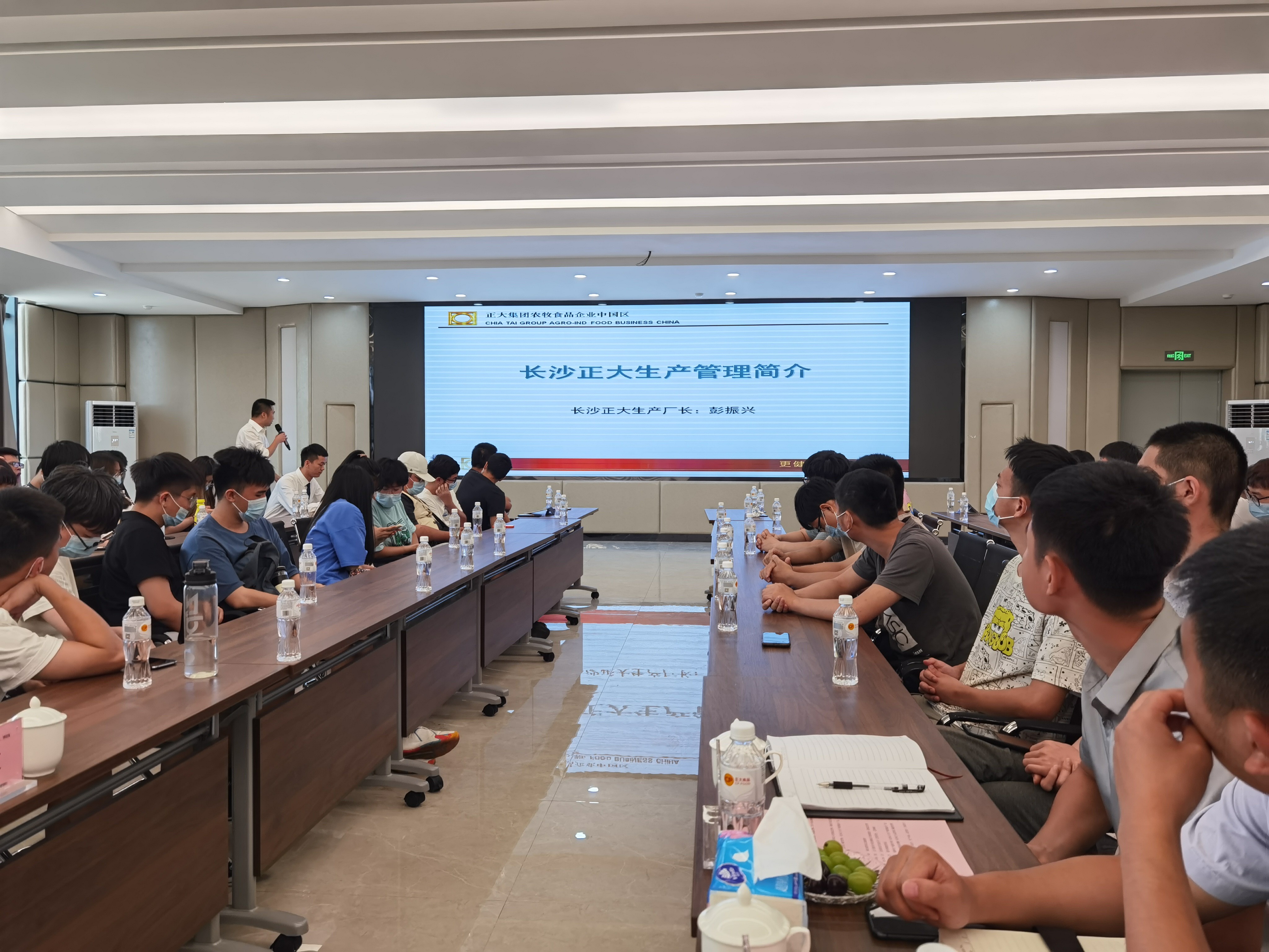 进入企业之前,动科院每一位师生均进行了全身消毒,随后,企业工作人员带领动科院师生前往二楼会议厅开展交流会。在正大集团工作人员的热情接待下,动科院师生共同观看了正大集团介绍短片,短片详细的介绍了集团创建理念、企业文化以及今后的发展方向,这让前来参观学习的同学们对正大集团有了一个初步的了解。随后,集团高层与动科院师生共同进行了座谈会,期间,湖南区饲料事业生产总监进行了饲料生产流程介绍,品管部经理进行了饲料品管知识讲解。此座谈会目的在于促进高校与企业之间的交流,让同学们了解饲料生产工艺的相关知识。会上,集团总裁邓红成对动科院师生的访问表示了热烈的欢迎,他表示:此次教学实习是一个很好的契机,集团提供一个平台,让同学们有足够的机会掌握课本以外的知识,高校提供人才,同学们通过短暂的实习能够了解集团的企业文化及未来发展前景,借此机会吸纳更多优秀的人才加入正大集团,这是一个双赢的局面。之后,同学们在工作人员的带领下分3批次参观长沙正大展厅、生产车间和成品库、品管部。
