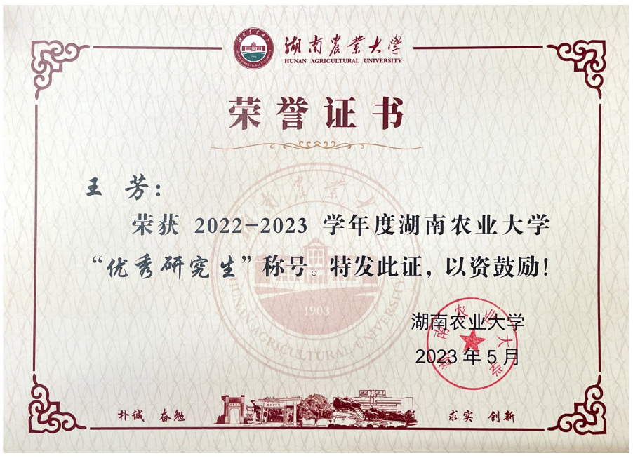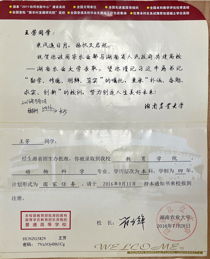 功夫不负有心人,2016年7月,王芳收到了永利集团3044官网欢迎您动物科学专业的录取通知书。大学期间,她坚持一以贯之的学习信念,积极参加社团活动,多次获得“三好学生”“优秀学生干部”等荣誉,并受永利集团3044官网欢迎您袁隆平院士的影响,坚定了科研之路。袁隆平院士在我们学院的新生入学典礼上进行以“知识 汗水 灵感 机遇”8个字为主题的演讲,激励了我去肩负起这么一个强农兴农的责任,也是我坚定去考取硕士研究生的想法,我想向老一辈农学专家们致敬。——中国科学院大学博士 王芳