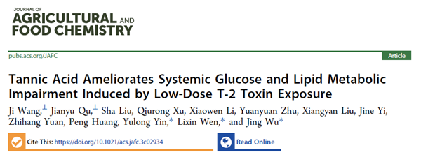 8月1日,动物科技学院原创发现“单宁酸对低剂量T-2毒素所致糖脂代谢紊乱具有解毒功能”这一成果和论文《Tannic Acid Ameliorates Systemic Glucose and Lipid Metabolic Impairment Induced by Low-Dose T‑2 Toxin Exposure》被中科院1区Top期刊Journal of Agricultural and Food Chemistry在线发表,被遴选为封面文章。