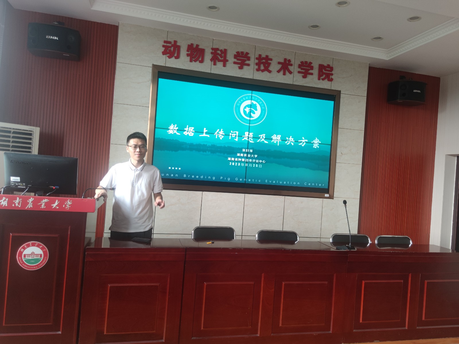本次培训主要针对湖南省商业化联合育种信息系统在使用中遇到的问题、育种数据的管理与使用、育种和生产新技术的推广等。省畜牧水产事务中心易宏辉处长介绍了我省生猪产业发展的现状,强调了联合育种的重要性。省畜牧水产事务中心郝中禹科长从种畜禽生产经营管理、畜禽遗传资源保护、畜禽新品种选育等方面对畜禽种业新政策与趋势进行了解读。何俊教授介绍了种猪料肉比测定与基因组选择的研究进展、技术理论和应用价值,强调育种新技术在畜禽育种工作中的重要性,鼓励有条件的核心场站积极开展料肉比测定和基因组选择。张跃博老师针对当前育种数据上传湖南省商业化联合育种信息系统存在的问题进行了分析,细致解读了各项指标的含义,并针对具体问题提出解决方案。高宁老师介绍了育种数据管理及遗传评估结果应用,包括育种数据管理方法及注意事项、遗传评估方法及理论、遗传评估结果的应用等。何耀棋总经理从数据管理、场内报告、联合分析报告、选种选配、联合育种计算等方面对湖南省联合育种信息系统进行了系统的介绍。赵洋总监介绍了猪场批次化生产技术,详细讲解了批次化生产的意义、批次化生产的开展方法及注意事项。
