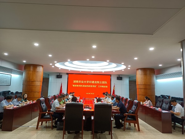 7月2日上午,我校动科院畜牧学科带头人印遇龙院士团队负责的“莓茶新饲料添加剂研发项目”工作推进会在学校党委会议室召开,会议由印遇龙院士主持。省发改委副主任李学斌、省发改委高技术处处长符巨波、省农业农村厅畜牧兽医处处长武深树、省畜牧水产事务中心副主任欧阳龙、省农业农村厅产业处副处长熊德红等领导,北京大伟嘉集团董事长廖峰、湖南加农正和生物技术有限公司董事长柳高峰、长沙绿叶生物科技有限公司总经理何兴国等企业领导代表与会。学校科技处、研究生处、人事处等单位负责人、动物科技学院贺喜院长、方热军教授等教师参会。