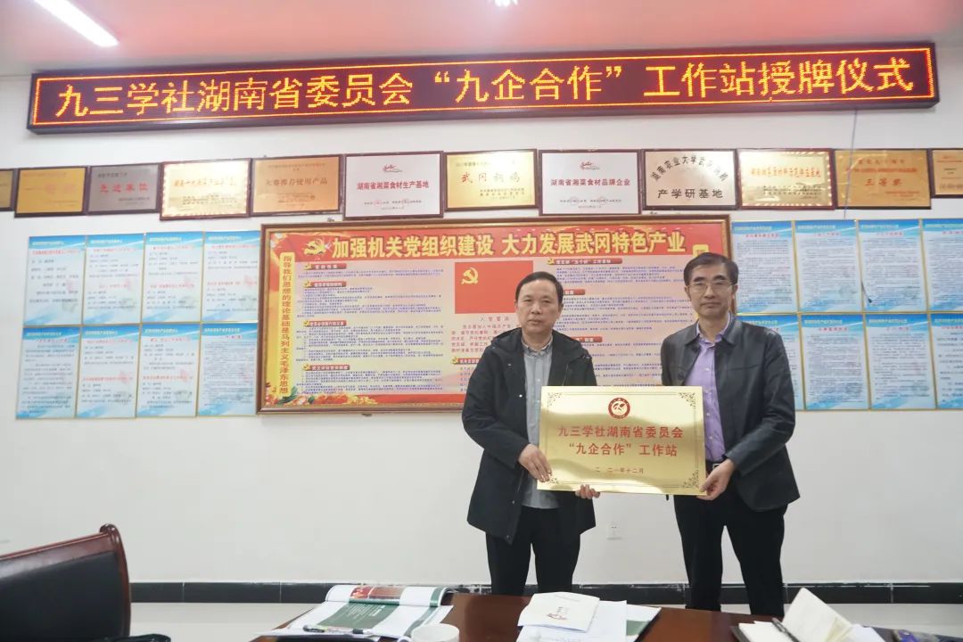 九三学社湖南省委与湖南武冈铜鹅农业发展有限公司合作,建设我省首个“九企合作”工作站。图为省政协副主席、九三学社湖南省委主委张大方(右)为工作站授牌。